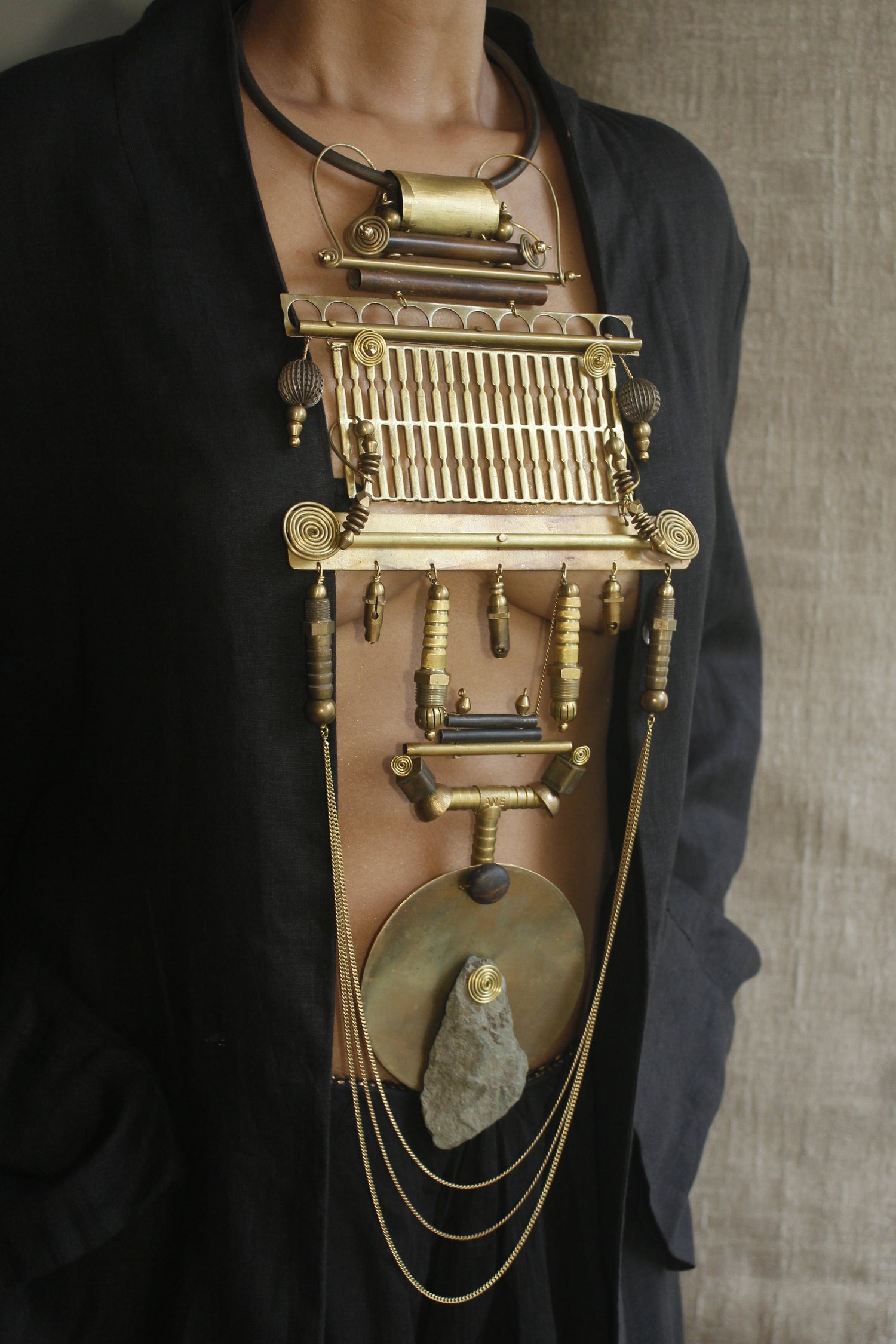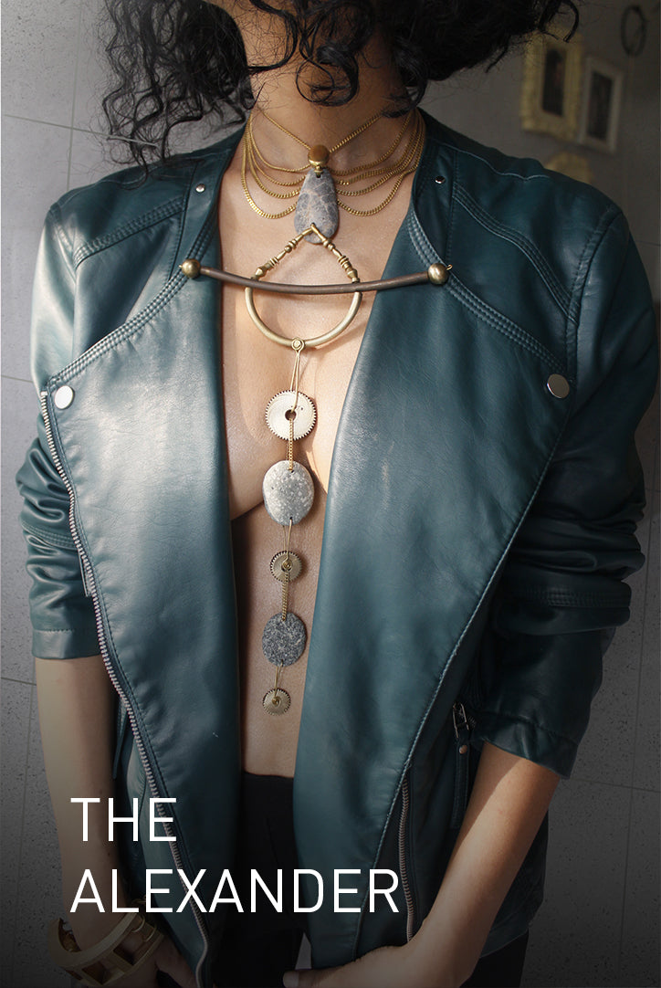 We have used forms and material to create androgynous, gender fluid beauties. The one in the pic features a single casted heavy metal ring as pendant along with ucycled brass pipe and a gorgeous green stone from Hokitika, Newzealand.