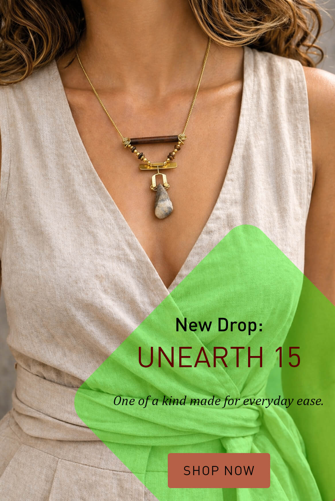 We have used forms and material to create androgynous, gender fluid beauties. The one in the pic features a single casted heavy metal ring as pendant along with ucycled brass pipe and a gorgeous green stone from Hokitika, Newzealand.