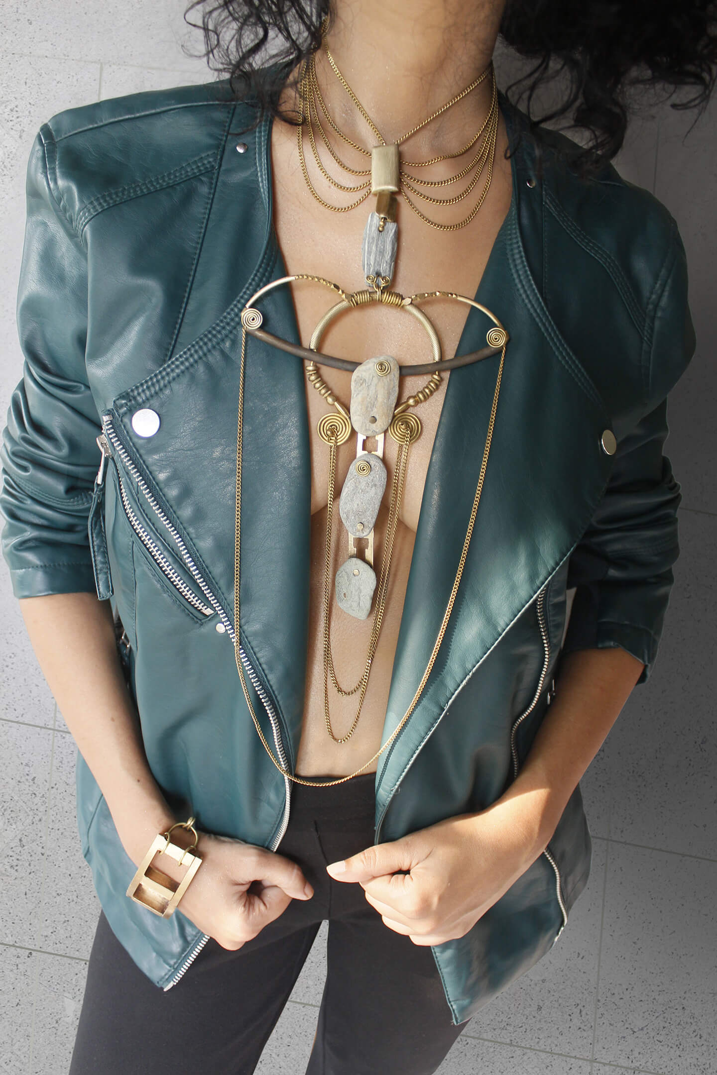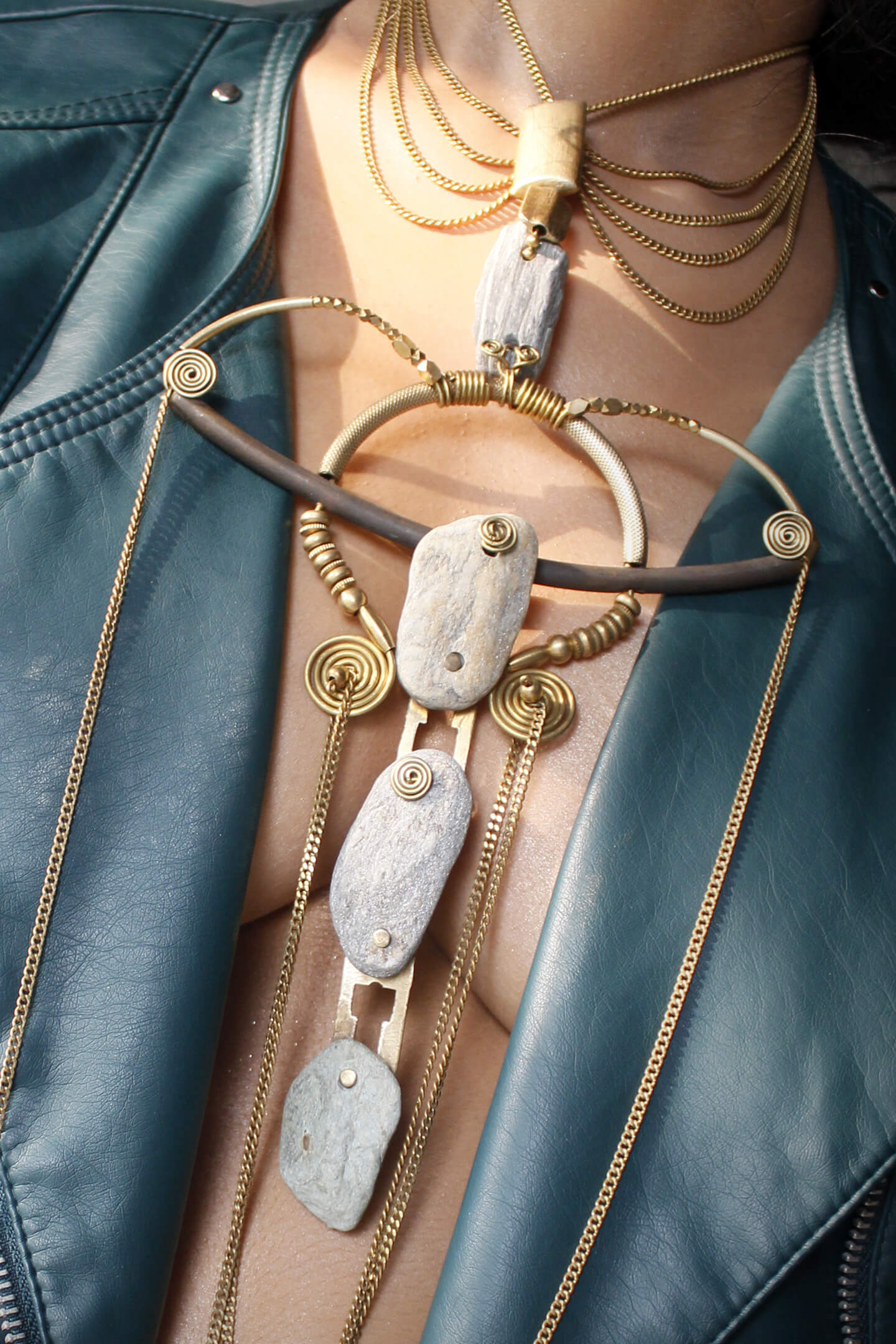 Alexander's each piece is crafted from upcycled brass fabrication waste, brass pipes, bangle fragments, and beads, transforming discarded materials into wearable masterpieces. Brass chain-work adds a sense of rhythm and movement to this bold collection. Carefully selected stones sourced from the mighty rivers of Jhanskar, Beas, the Ganges, and Spiti etc bring a touch of natural beauty to each design.