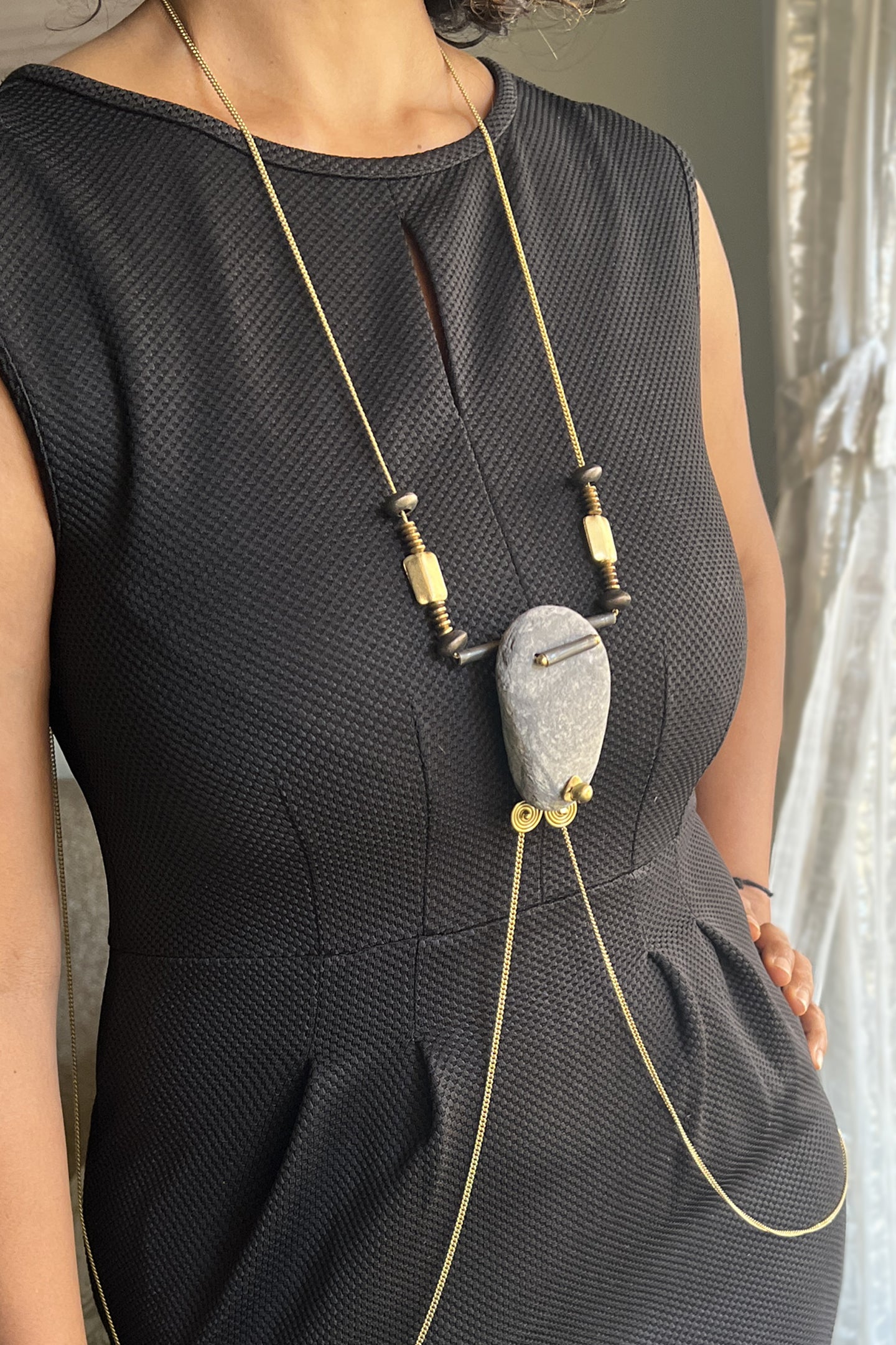This series features a bold, intricately handcrafted pendant, designed to command attention. Each piece pairs striking river pebbles, slate stones, and sandstone -handpicked from across India - with repurposed industrial metals. Brass chains add a harmonious flow, artfully tracing the natural curves of the female form. Together, these elements create a rhythm and elegance that celebrates the raw beauty of each material and the allure of the wearer.