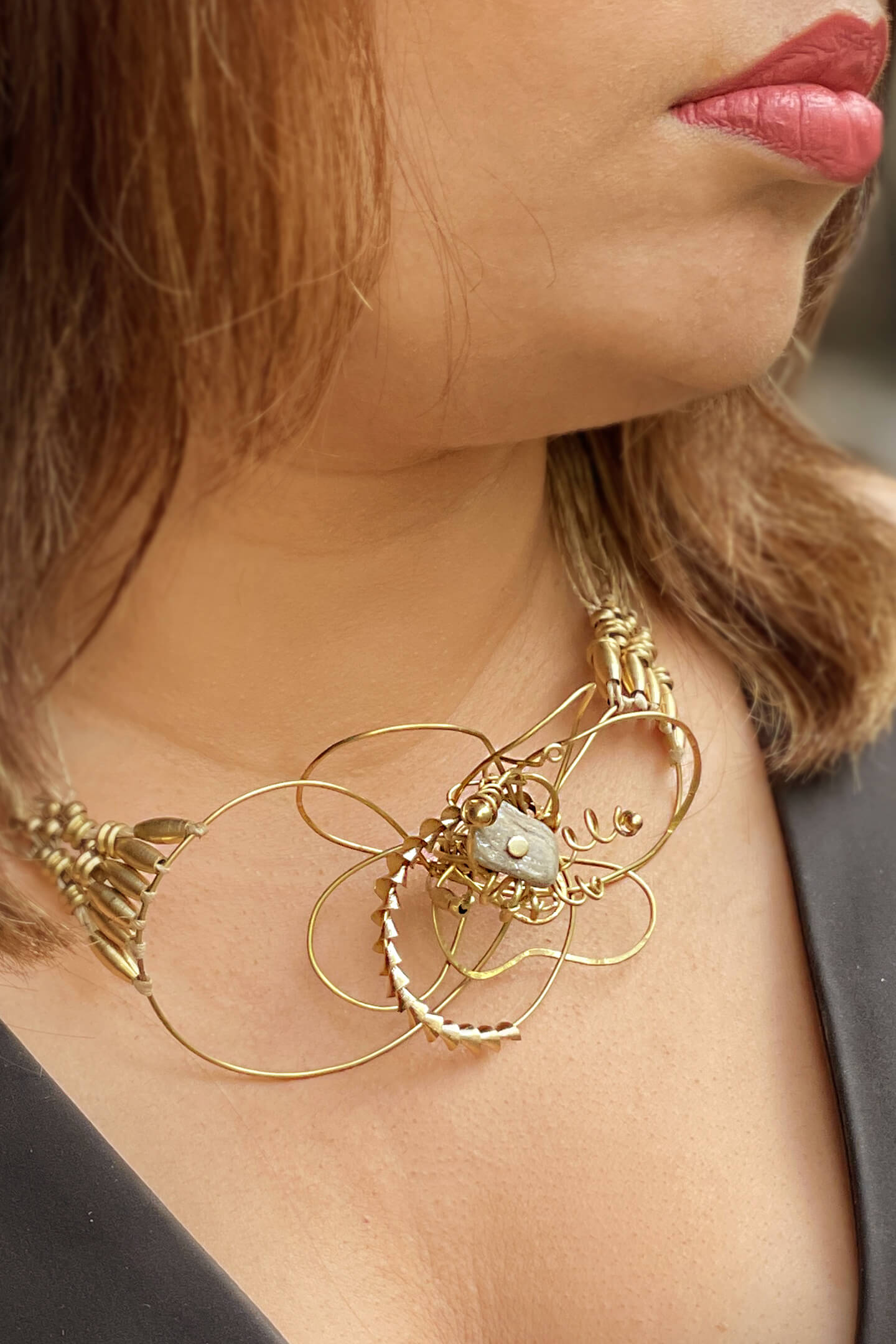 - The pronounced materials and forms in this collection stand out best against lively, modern outfits, creating an eye-catching statement.