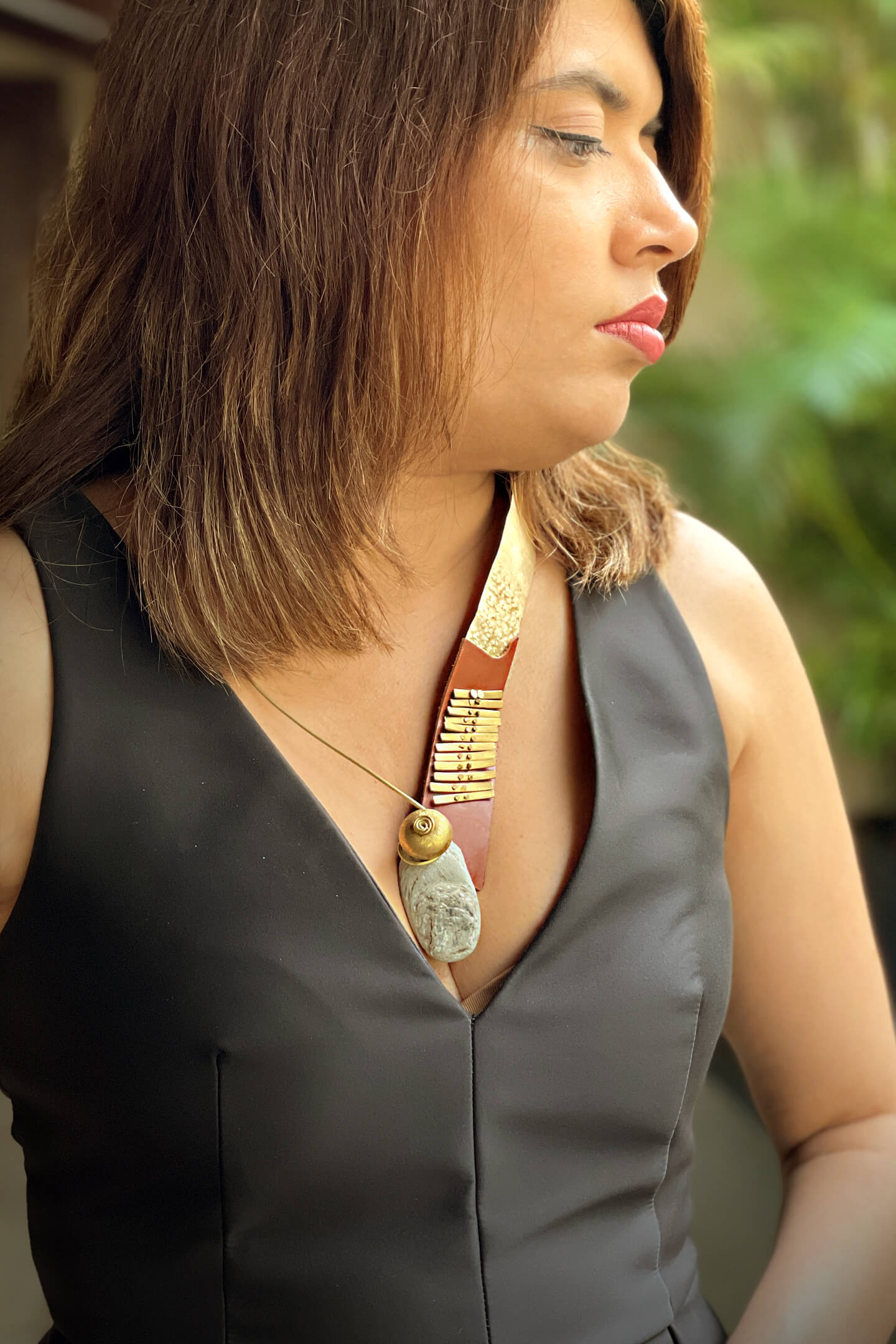 This neckpiece features a bold mix of hand-beaten brass and intricately placed upcycled metal strips. Paired with a sleek wire closure and a unique Baspa River rock, it offers a perfect balance of craftsmanship and natural beauty.