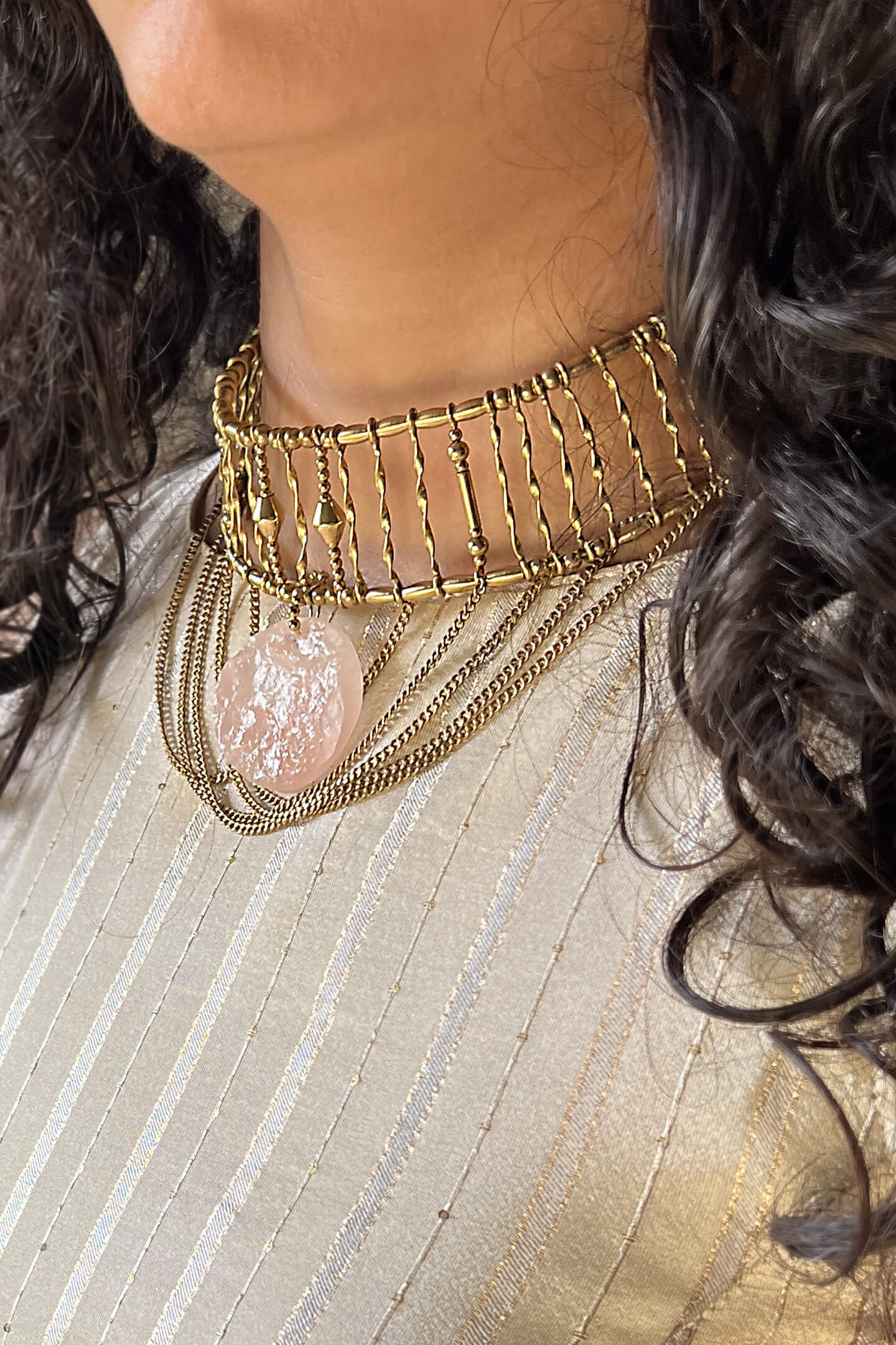 Complement these pieces with earthy tones to let the natural beauty of the crystals and metals shine.