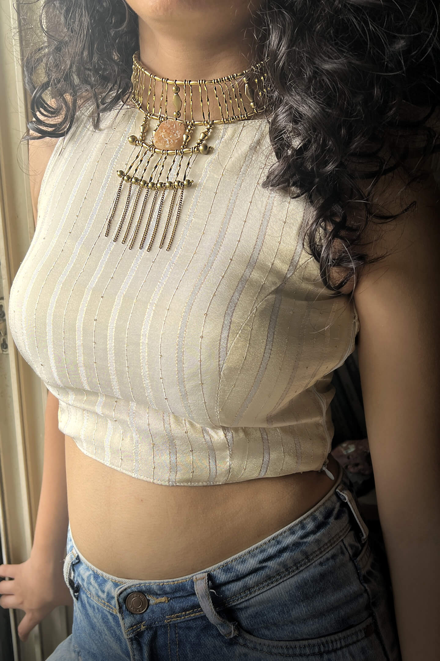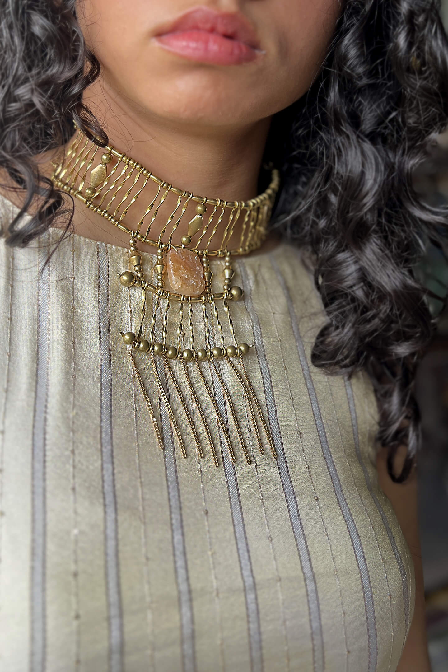 This exquisite choker showcases a dazzling lapis lazuli crystal as its centre piece. Hand-beaten brass wires, expertly twisted and interlinked, form a delicate yet striking design, where elegance meets raw artistry. The vibrant blue of lapis lazuli adds a captivating touch, making this piece a true standout.