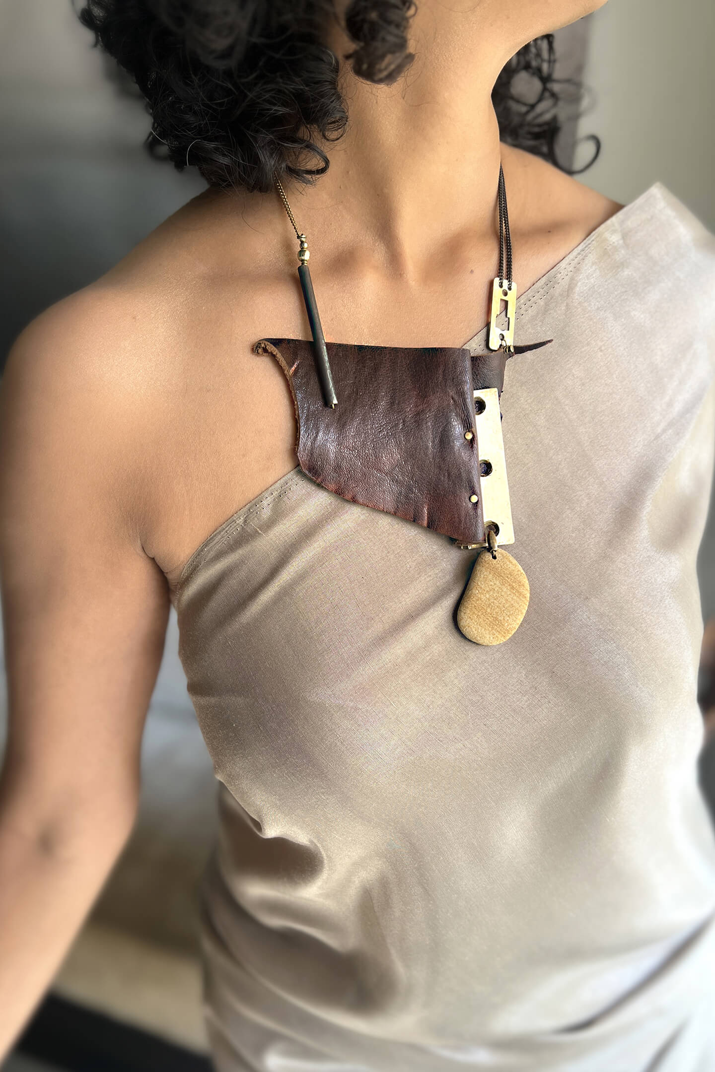 This neckpiece is crafted from sustainable materials like up-cycled industrial metal pieces, reused leather and natural stones sourced from rivers across India.