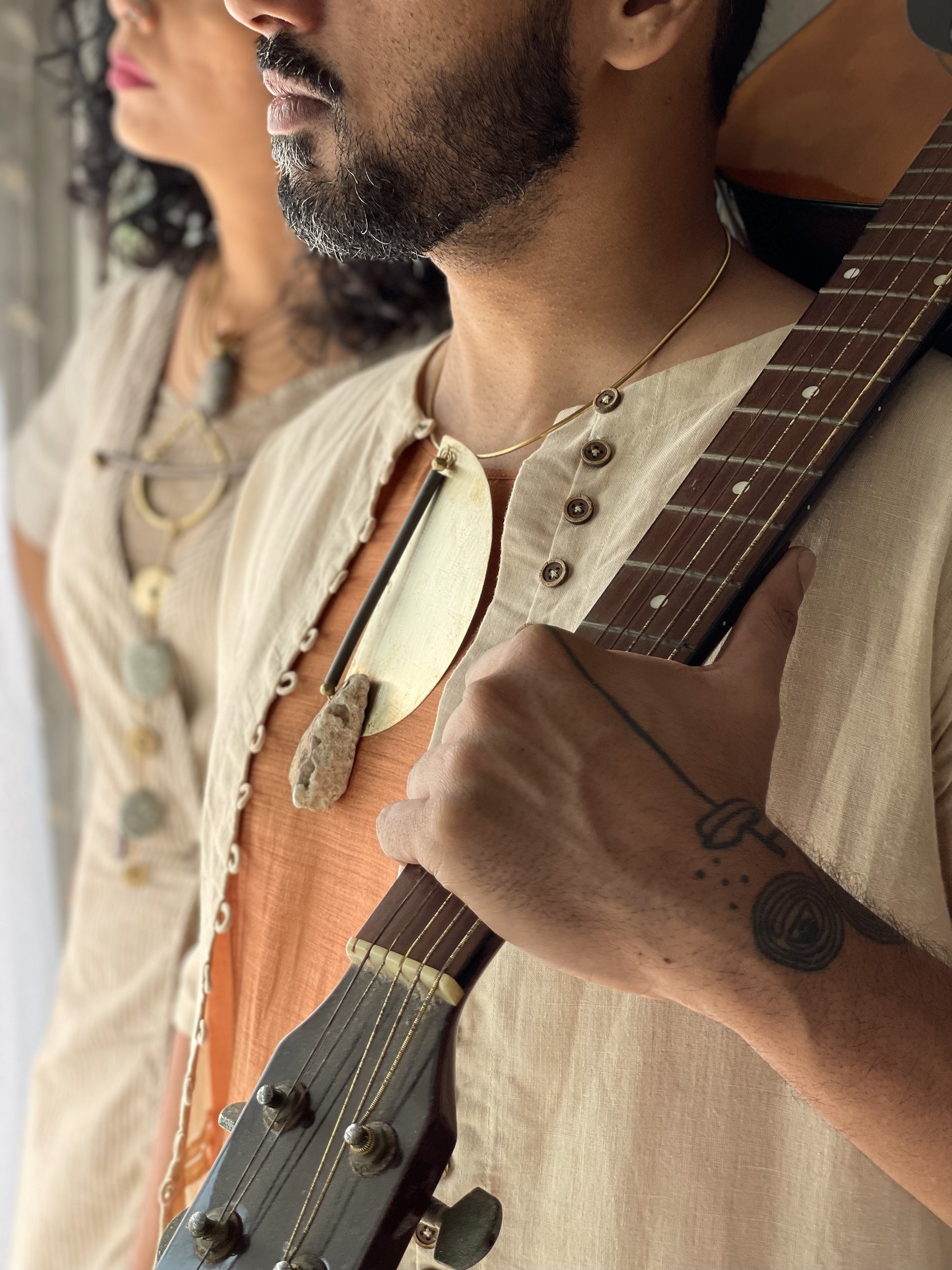 It is one of our latest designs that can blend seamlessly with traditional as well as with western attire. A moon cut up cycled brass plate infused with a sturdy rock from the Pangong lake brings a fresh new look to the piece.