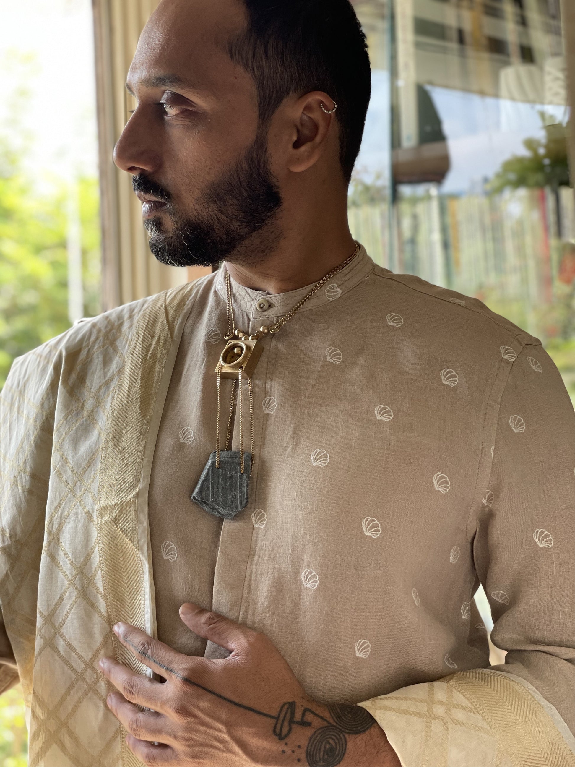 This chic necklace pendant set is for a man who radiates confidence. The chunky connector looks serious and add a stature to this beauty. Perfect when you want to look gorgeous but don't want to attract too much attention. It features a single casted heavy metal piece as pendant along with up-cycled brass chains and a knave slate stone from Nubra valley.
