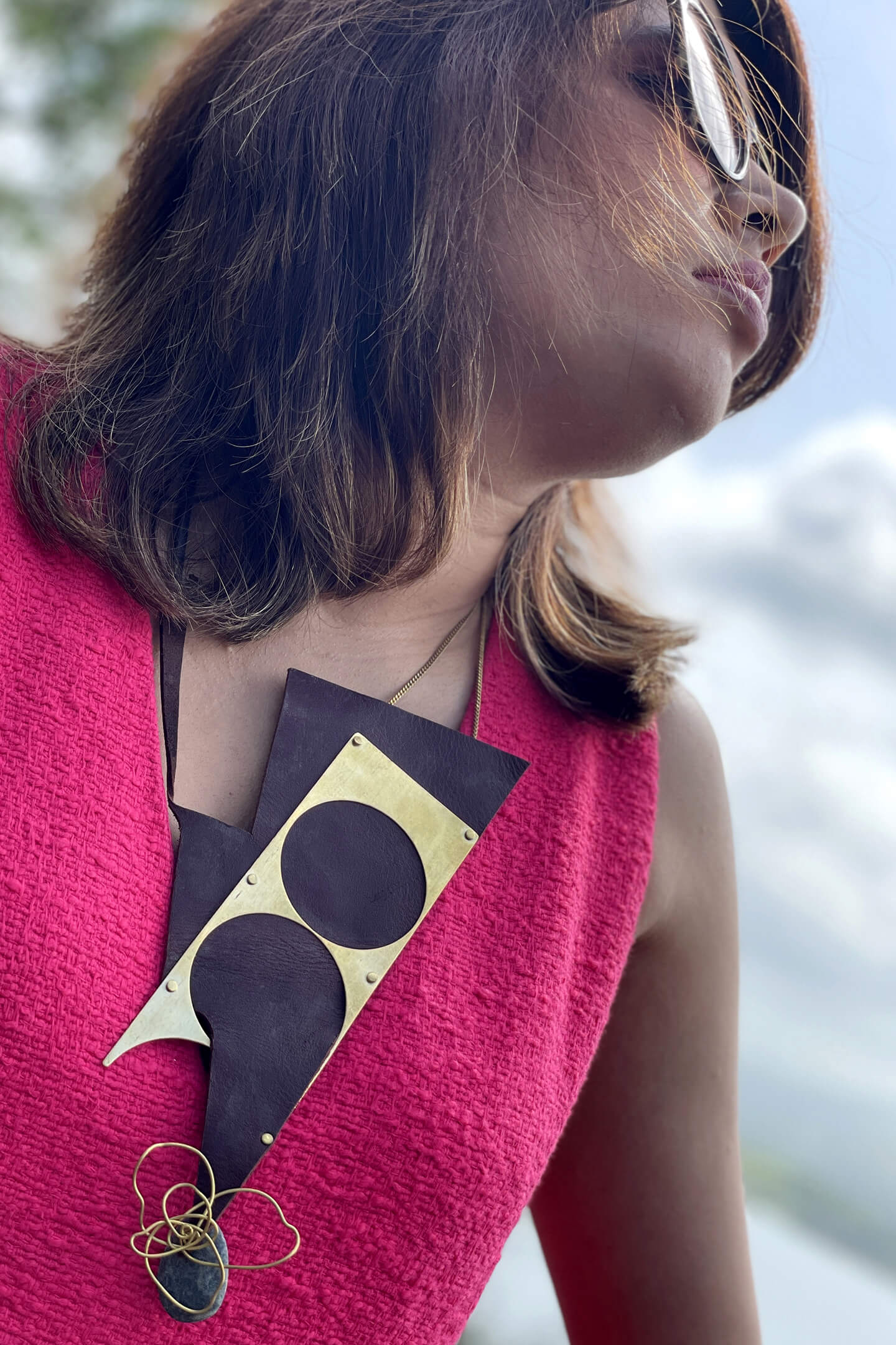 Magic Clasp is nothing short of a piece of an art with up-cycled leather patches put together in a tasteful design to adorn your lovely neckline. The re-used glossy brass plates adds a youthful glow to the design. The Zanskar river rock embellishes the delicate flower wire work to give it an outstanding fashionista look. Be it a wedding, a cocktail event or a traditional function, this necklace set can be worn to any event with a flamboyant attire. It's one of our must have pieces that you must own!