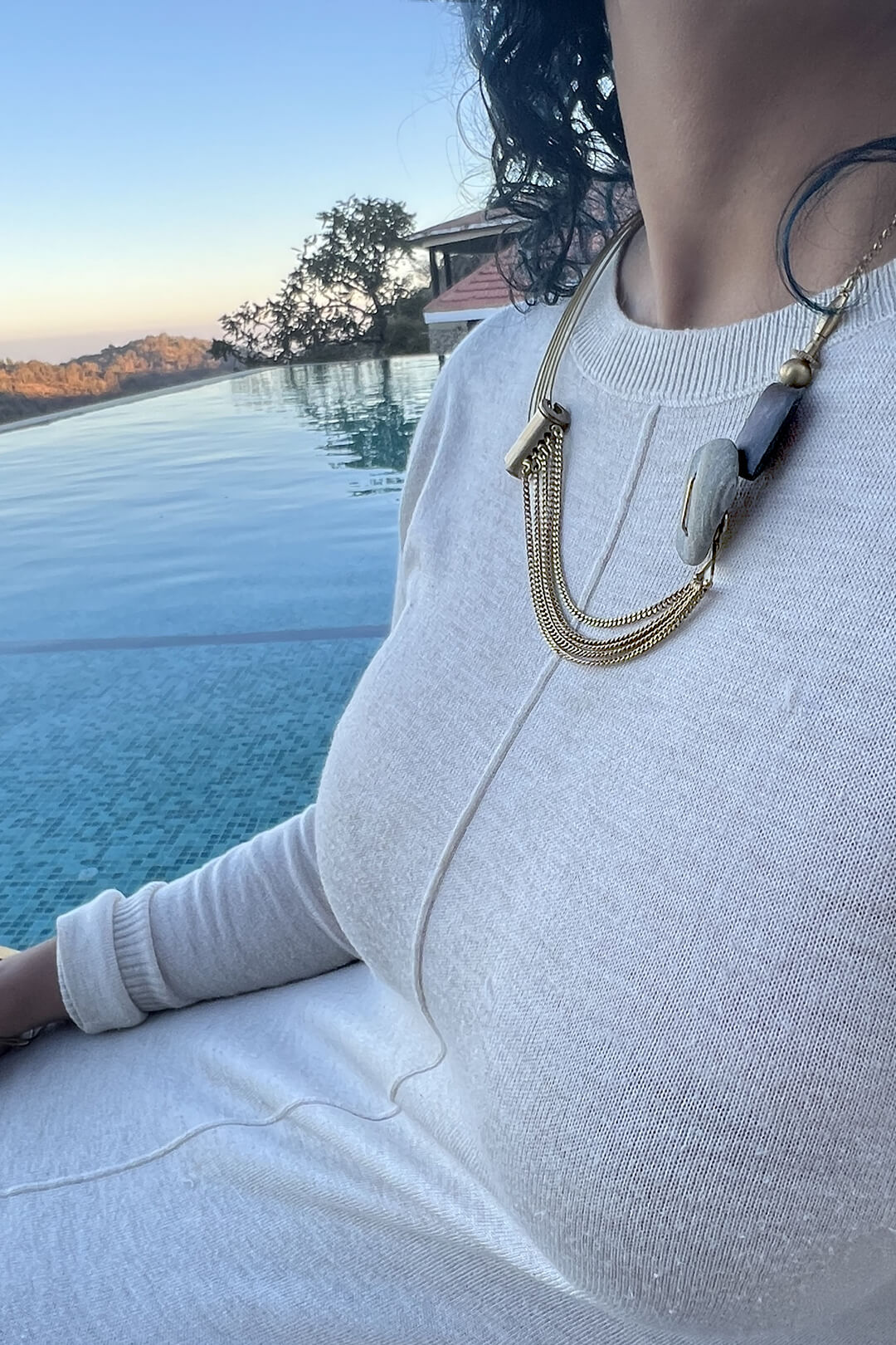 This series features a bold, intricately handcrafted pendant, designed to command attention. Each piece pairs striking river pebbles, slate stones, and sandstone -handpicked from across India - with repurposed industrial metals. Brass chains add a harmonious flow, artfully tracing the natural curves of the female form. Together, these elements create a rhythm and elegance that celebrates the raw beauty of each material and the allure of the wearer.