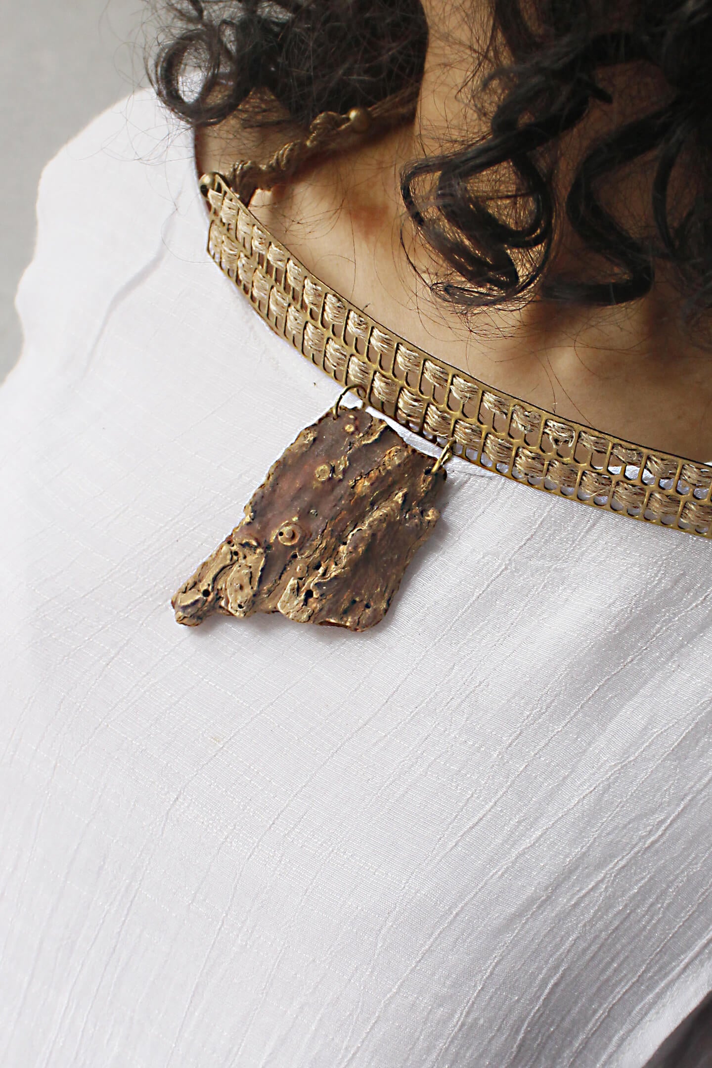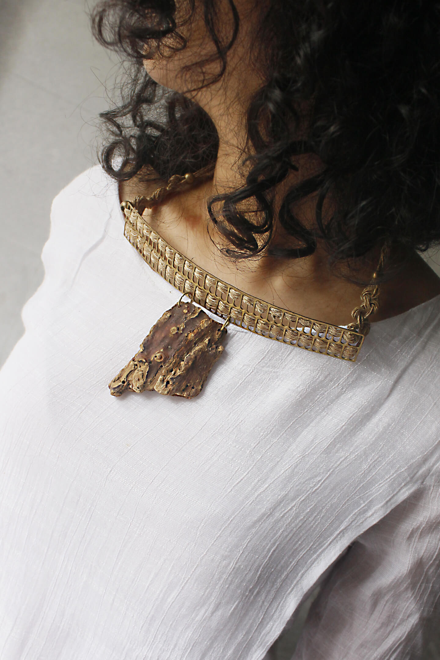 This neckpiece is crafted from sustainable materials, including hemp fibre, up-cycled industrial metal pieces, and natural stones sourced from rivers across India.
