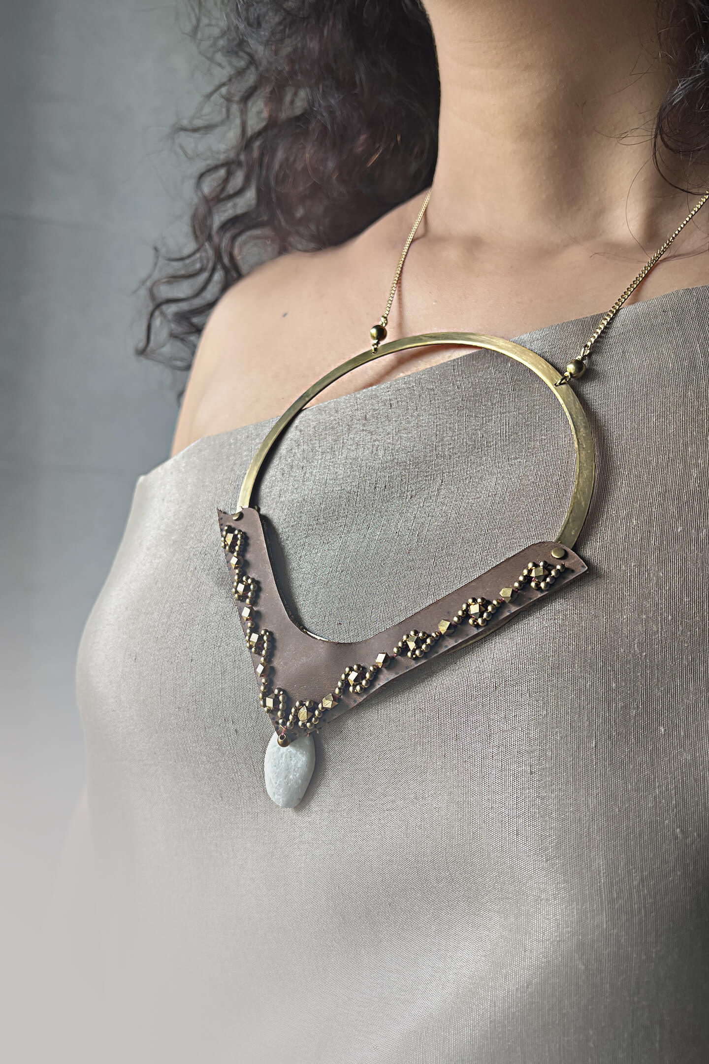 This piece features an arched metal ring paired with a repurposed leather boomerang design, accented with handwoven brass beads that form a striking pattern. A pristine white pebble from the valleys of Spiti graces the necklace, adding a touch of natural elegance.