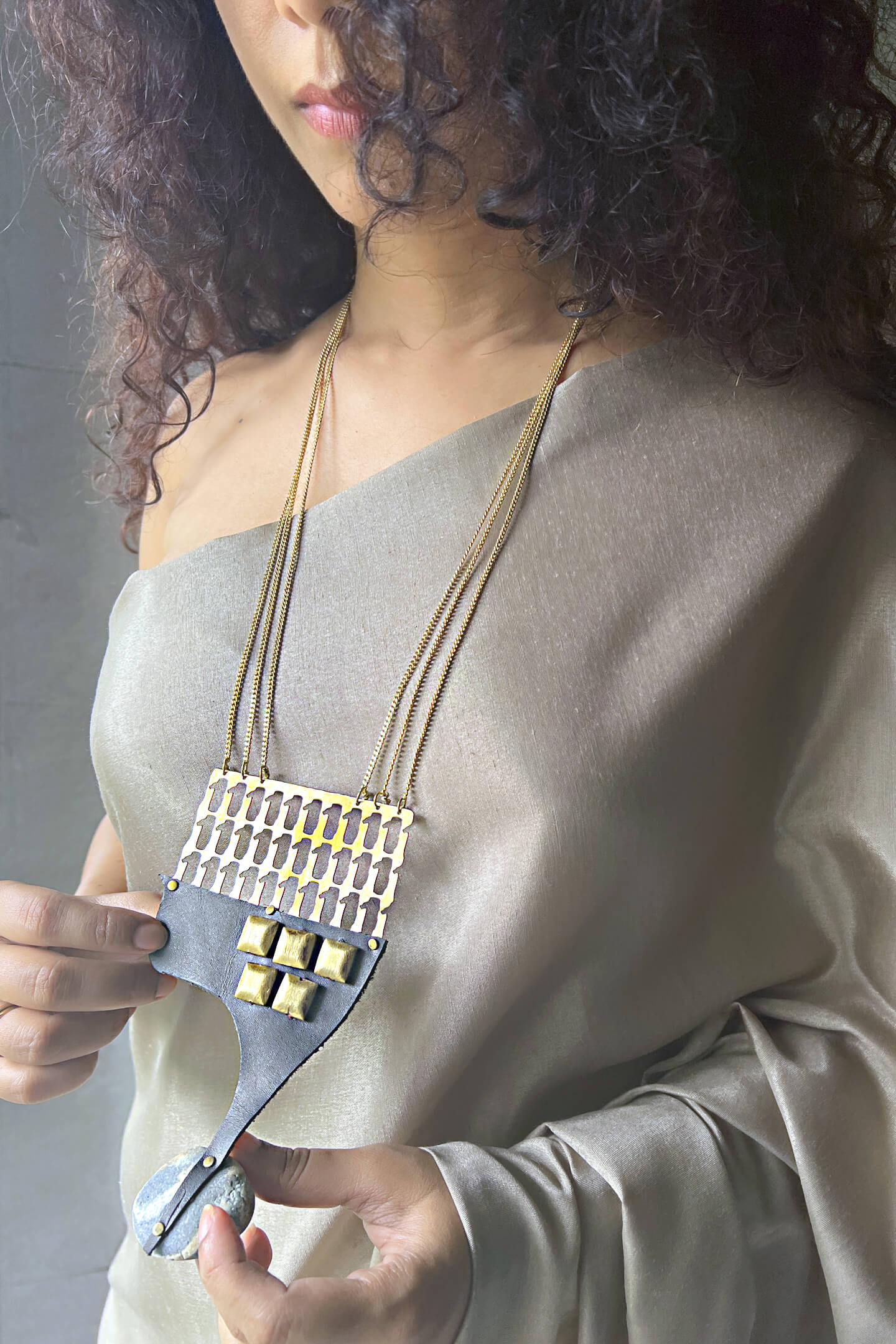 This neckpiece is crafted from sustainable materials like up-cycled industrial metal pieces, reused leather and natural stones sourced from rivers across India.