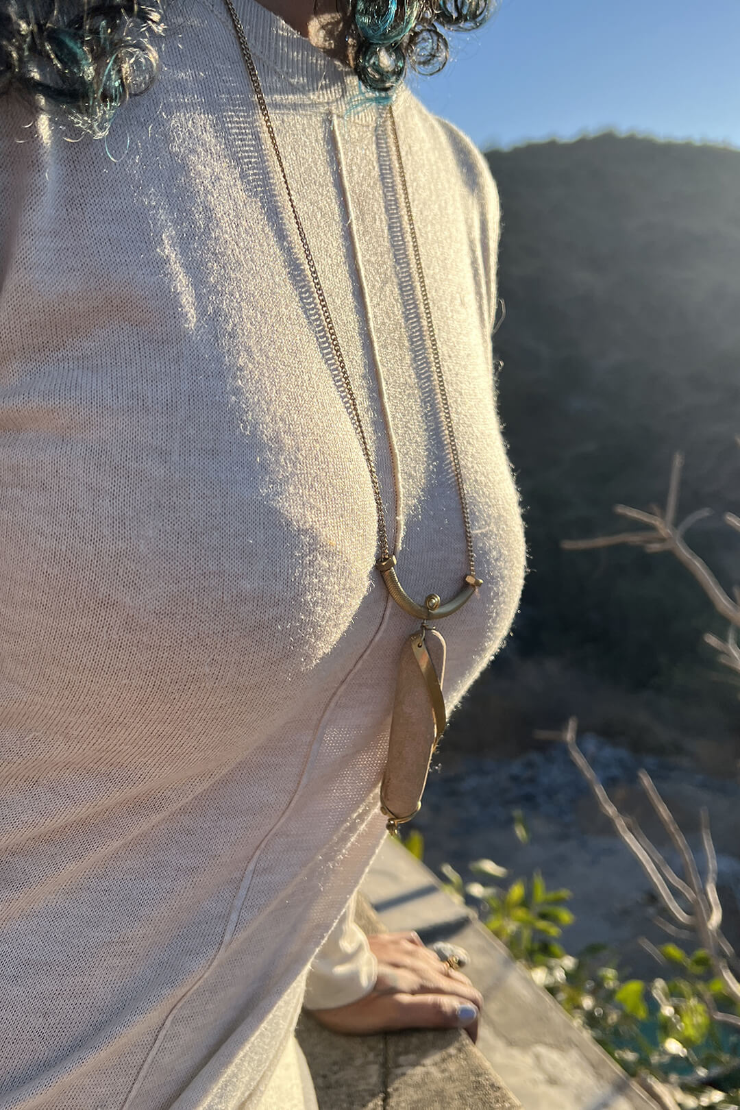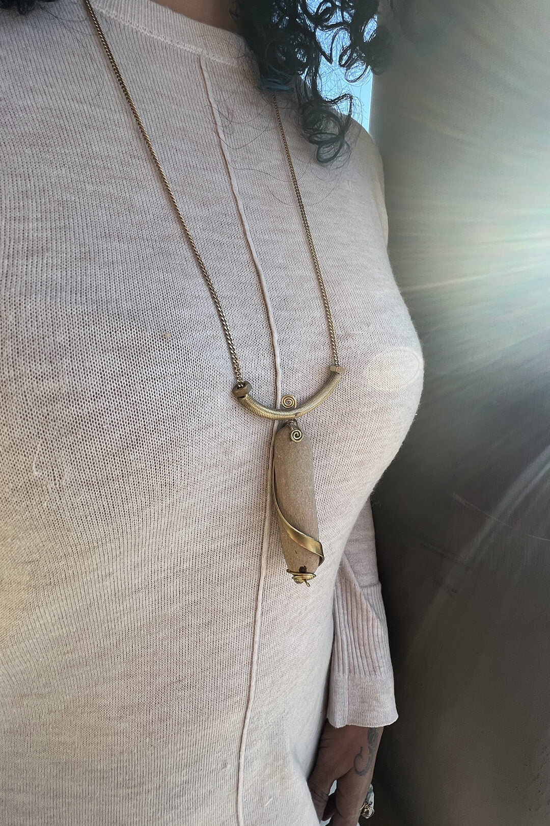This series features a bold, intricately handcrafted pendant, designed to command attention. Each piece pairs striking river pebbles, slate stones, and sandstone -handpicked from across India - with repurposed industrial metals. Brass chains add a harmonious flow, artfully tracing the natural curves of the female form. Together, these elements create a rhythm and elegance that celebrates the raw beauty of each material and the allure of the wearer.