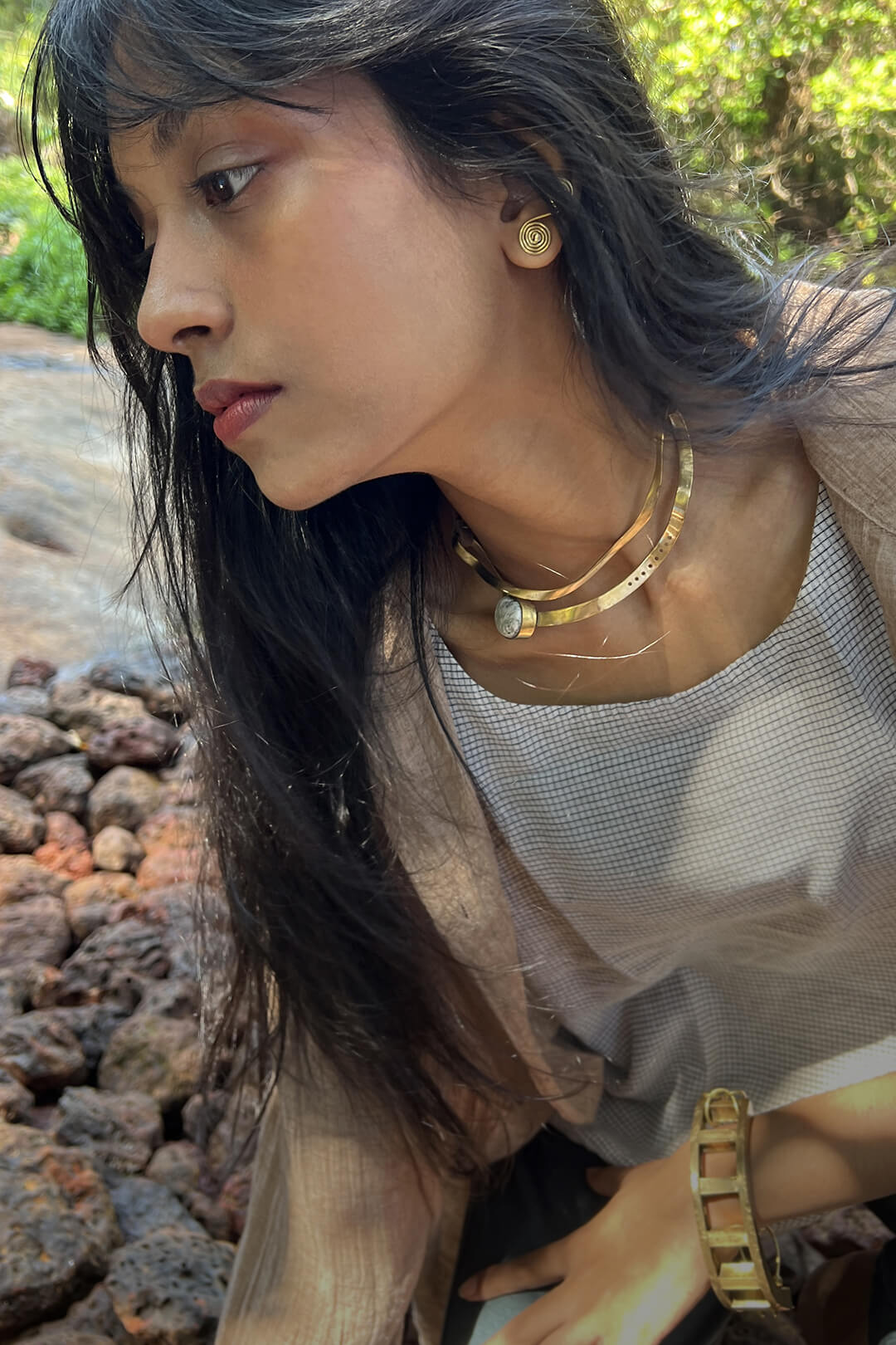 This series features hand beaten and twisted upcycled metal rings, river stones, and leather strings, designed for a bold yet natural look. The combination of industrial metal and earthy stones gives it a distinct, organic feel, perfect for everyday wear or making a statement. Each piece is made with care, ensuring no two designs are exactly alike.