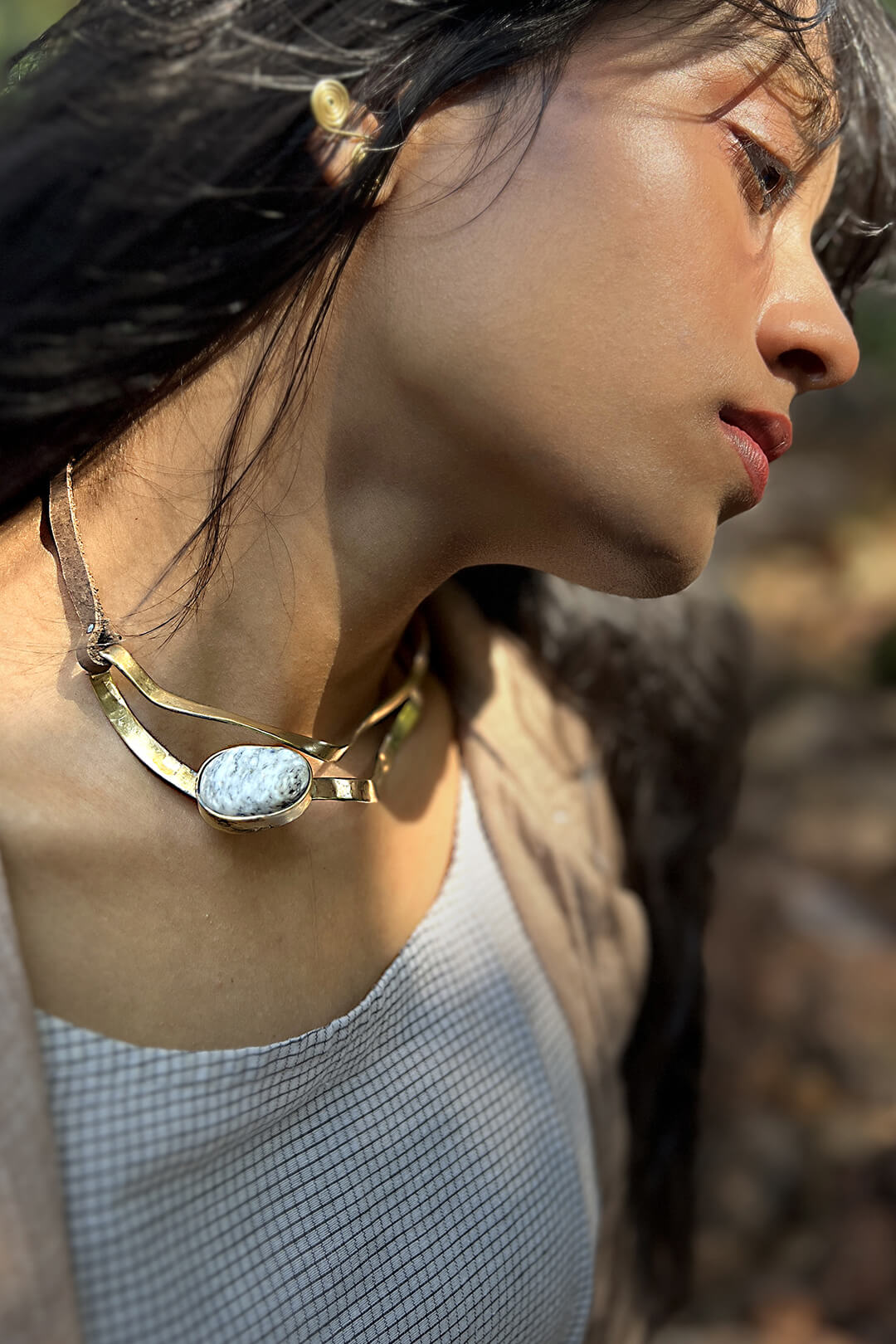 This neckpiece is Handcrafted from sustainable materials, up-cycled industrial metal pieces, Reused Leather strings  and natural stones sourced from rivers across India.