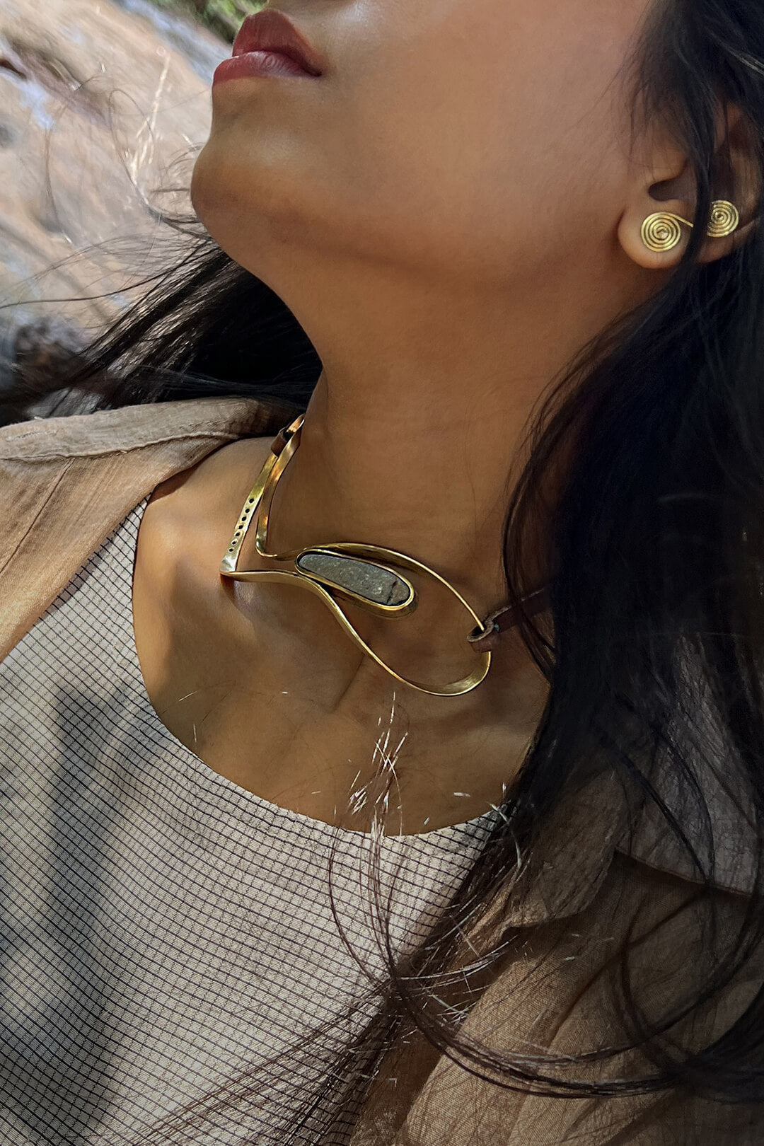 This neckpiece is Handcrafted from sustainable materials, up-cycled industrial metal pieces, Reused Leather strings  and natural stones sourced from rivers across India.