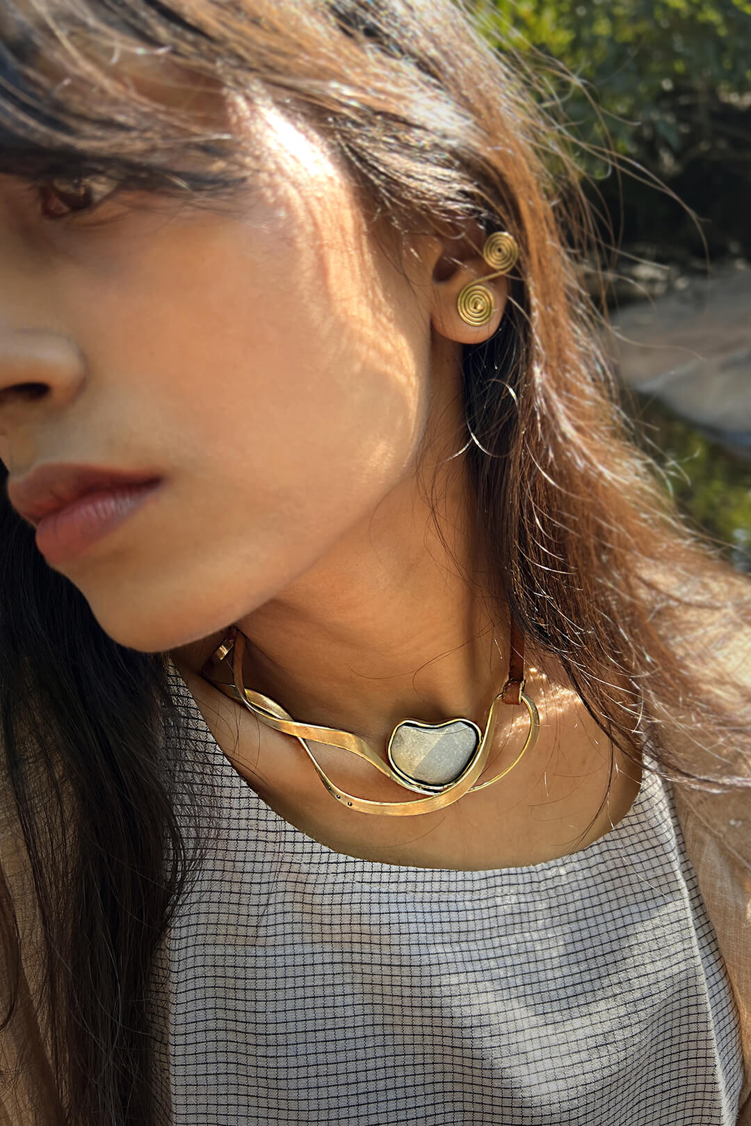 This series features hand beaten and twisted upcycled metal rings, river stones, and leather strings, designed for a bold yet natural look. The combination of industrial metal and earthy stones gives it a distinct, organic feel, perfect for everyday wear or making a statement. Each piece is made with care, ensuring no two designs are exactly alike.