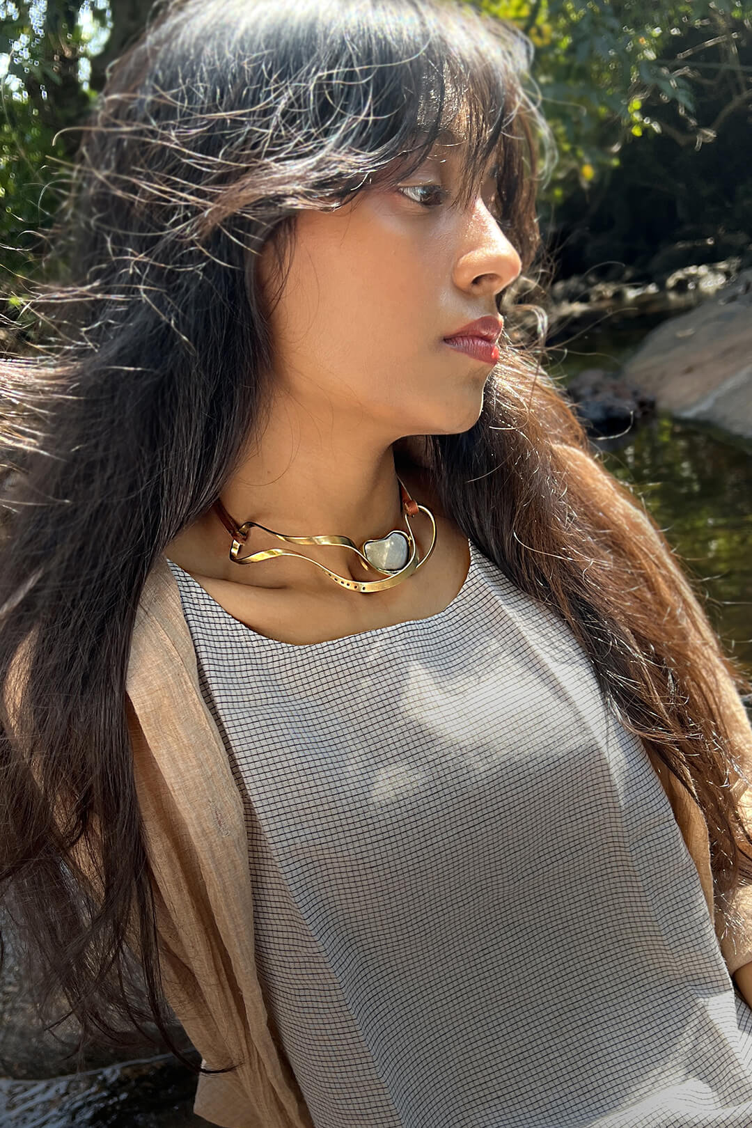 This neckpiece is Handcrafted from sustainable materials, up-cycled industrial metal pieces, Reused Leather strings  and natural stones sourced from rivers across India.