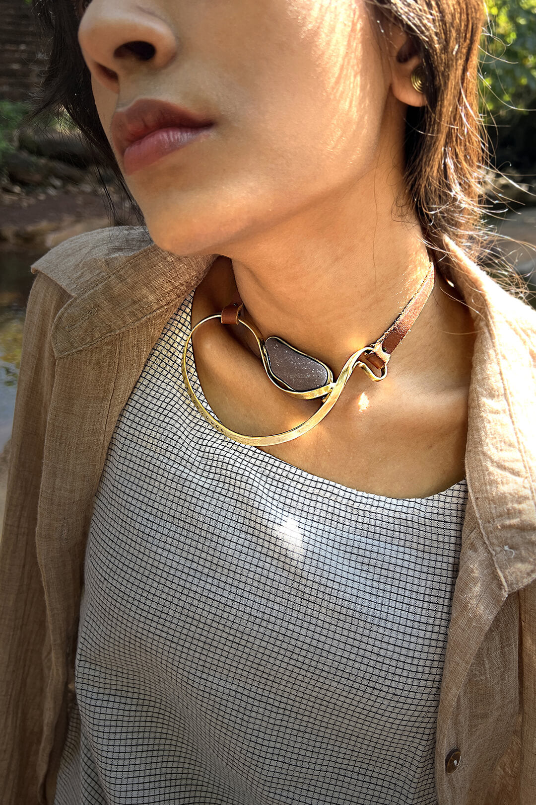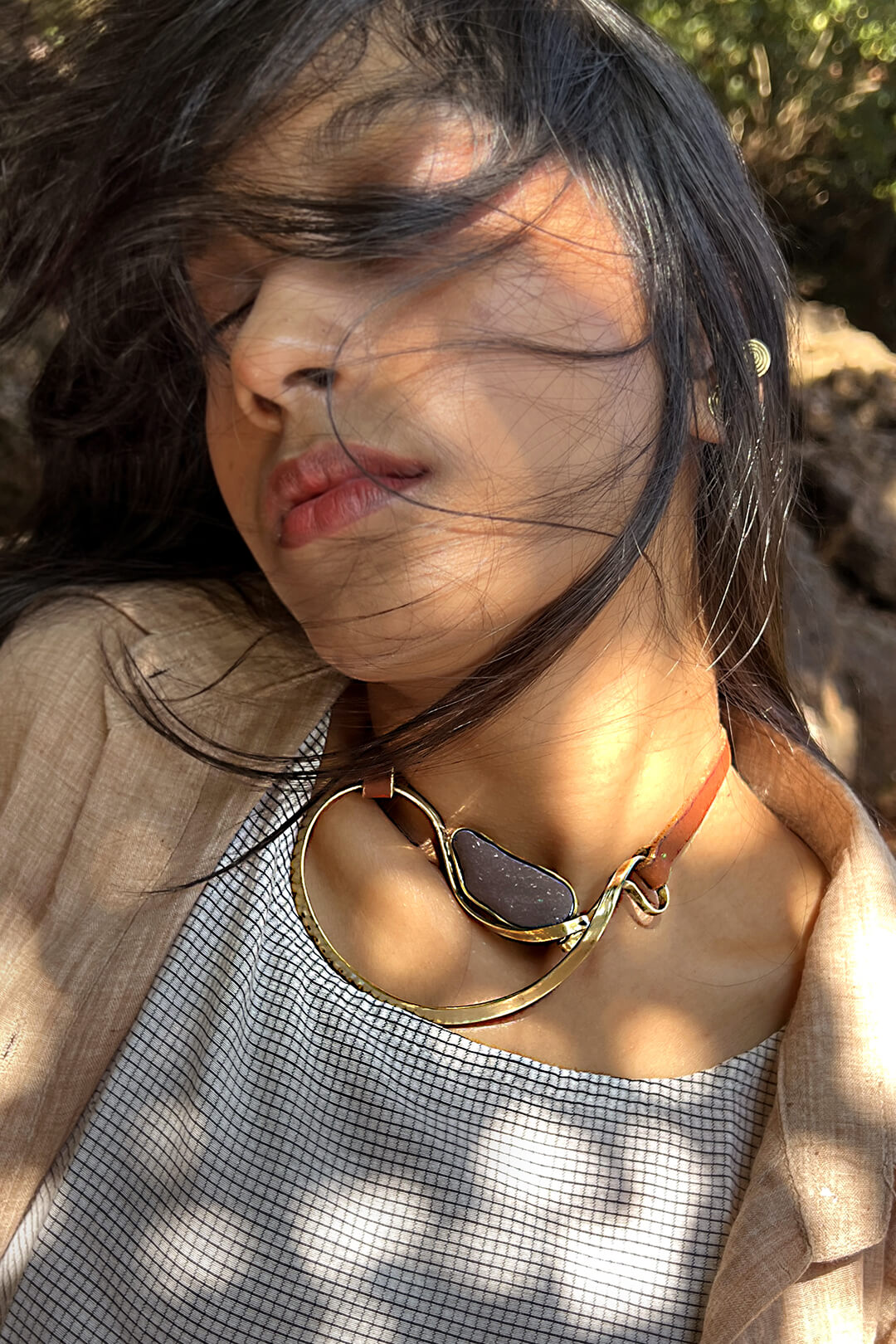 This neckpiece is Handcrafted from sustainable materials, up-cycled industrial metal pieces, Reused Leather strings  and natural stones sourced from rivers across India.