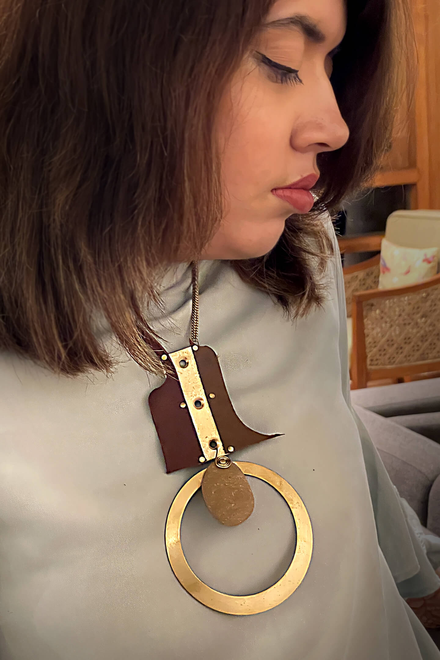 This unique neckpiece features a bold door hinge, an upcycled hollow metal ring, deep brown leather accents, and a stone from the beautiful Nubra Valley, all tied together with intricate coil work. With a blend of industrial charm and natural elegance, this piece stands out with character and flair.