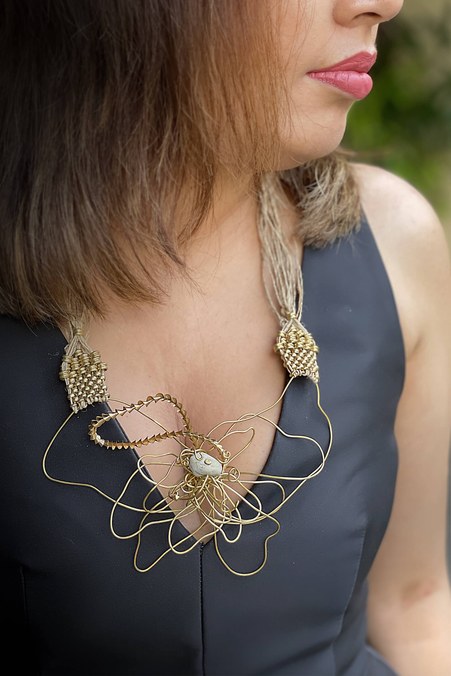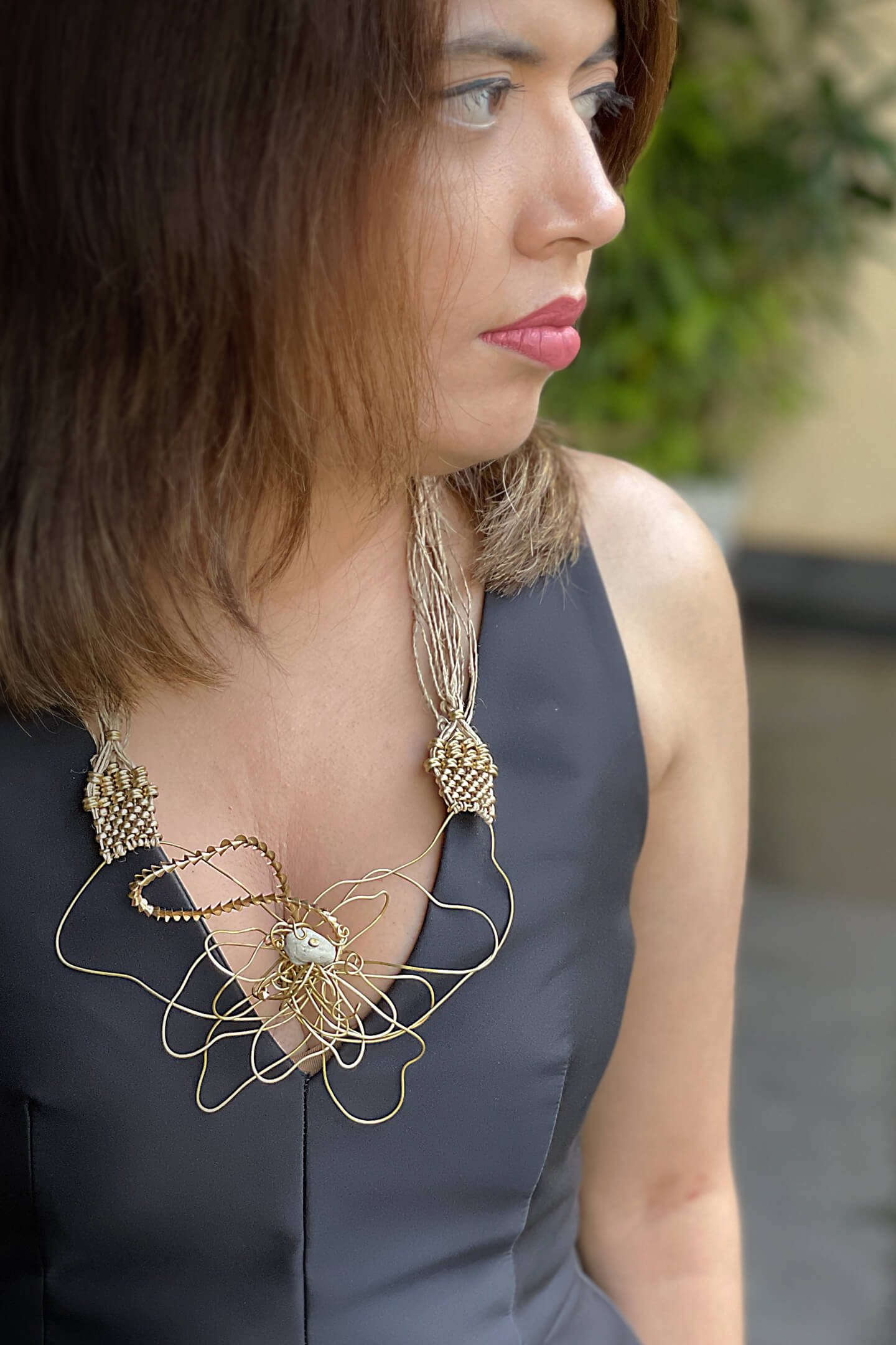 This necklace is meticulously crafted with hand-braided hemp fiber in an elegant macramé style and raw brass wires . At its heart, it features a unique stone sourced from the scenic shores of Ladakh, adding a touch of natural beauty to the piece. Designed to be versatile for any occasion.