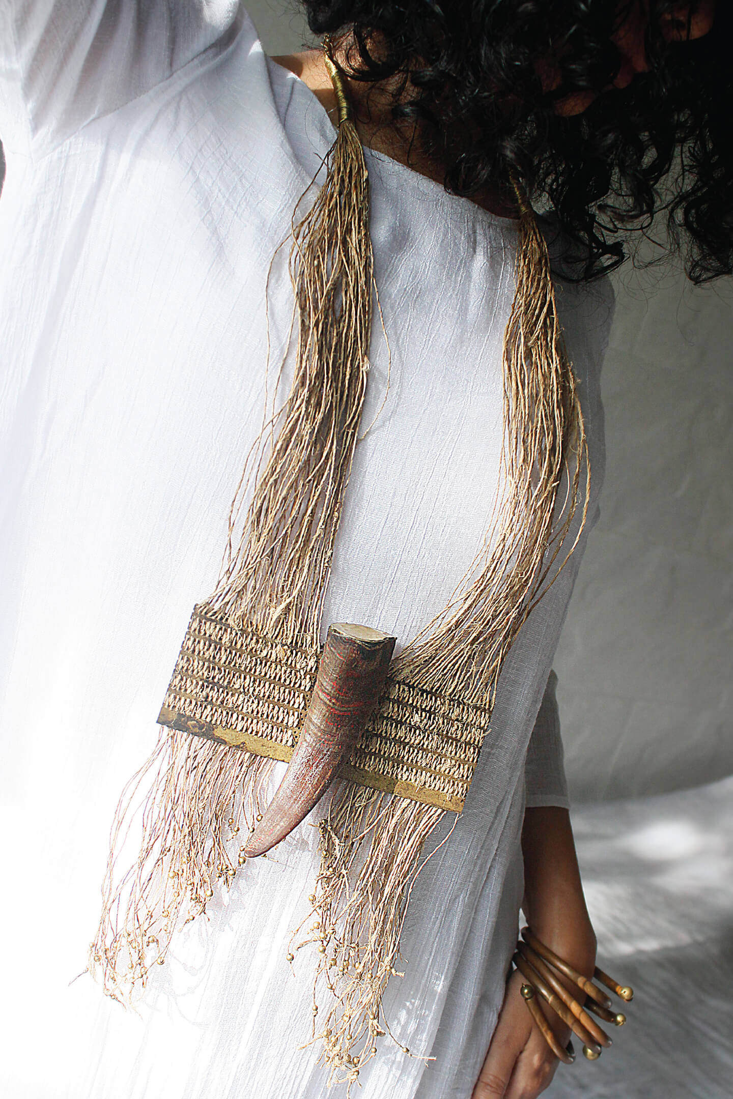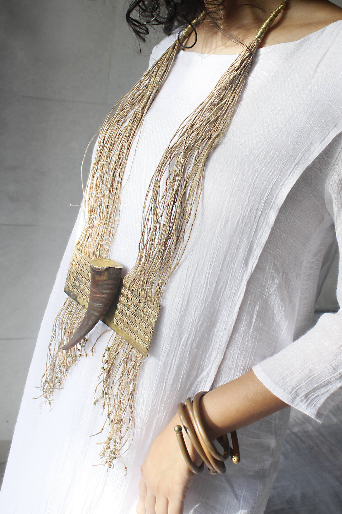 This neck piece is a class apart. Natural hemp fibre intricately woven in reused metal sheet and treated animal antlers gives it calm and serene look. Hemp fibre tassels adds to the tranquil quotient. It can be a perfect accessory to any outfit. Pair it with a plain chiffon saree or a linen outfit for a soothing look.