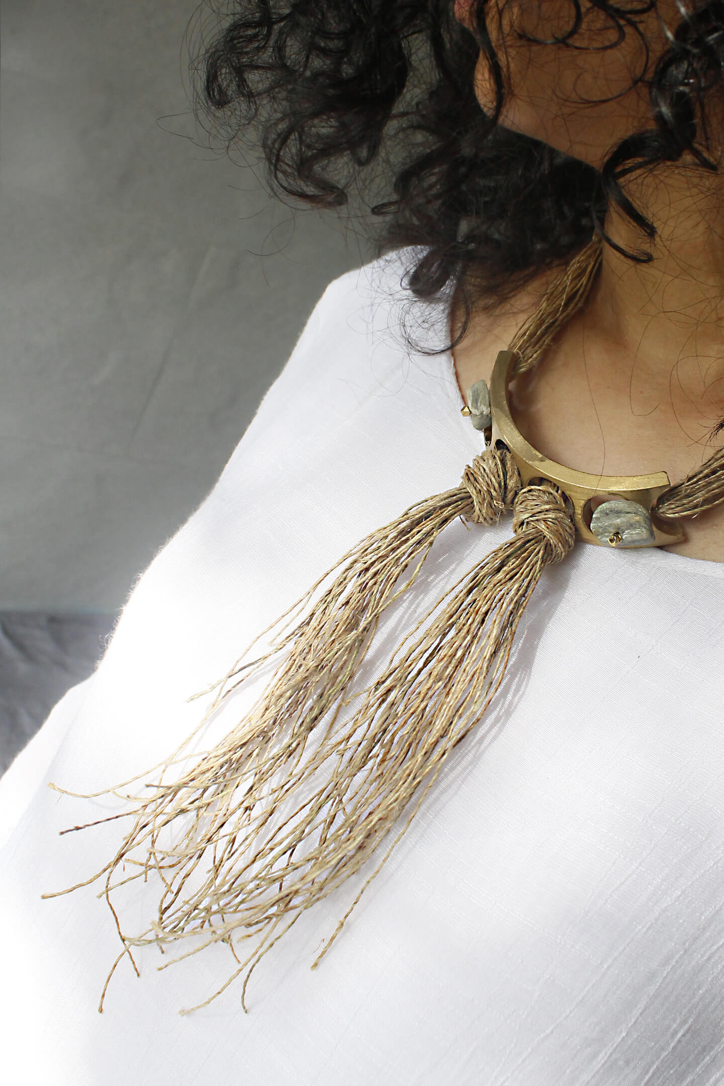 This neckpiece is crafted from sustainable materials, including hemp fibre, up-cycled industrial metal pieces, and natural stones sourced from rivers across India.