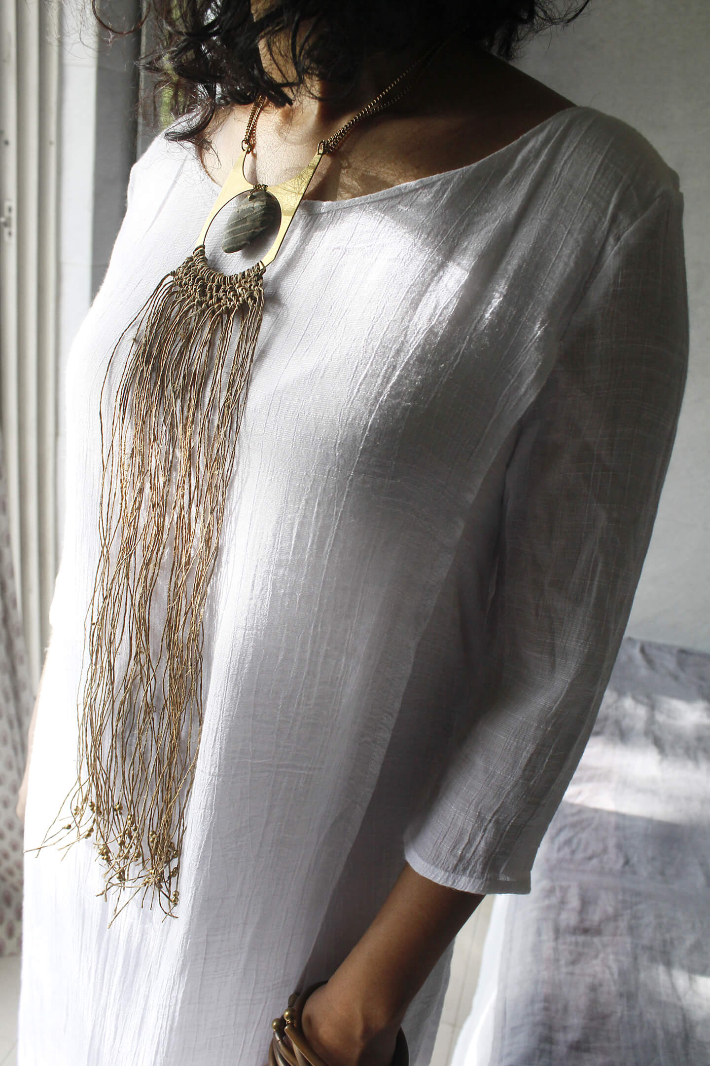 This neckpiece is crafted from sustainable materials, including hemp fibre, up-cycled industrial metal pieces, and natural stones sourced from rivers across India.