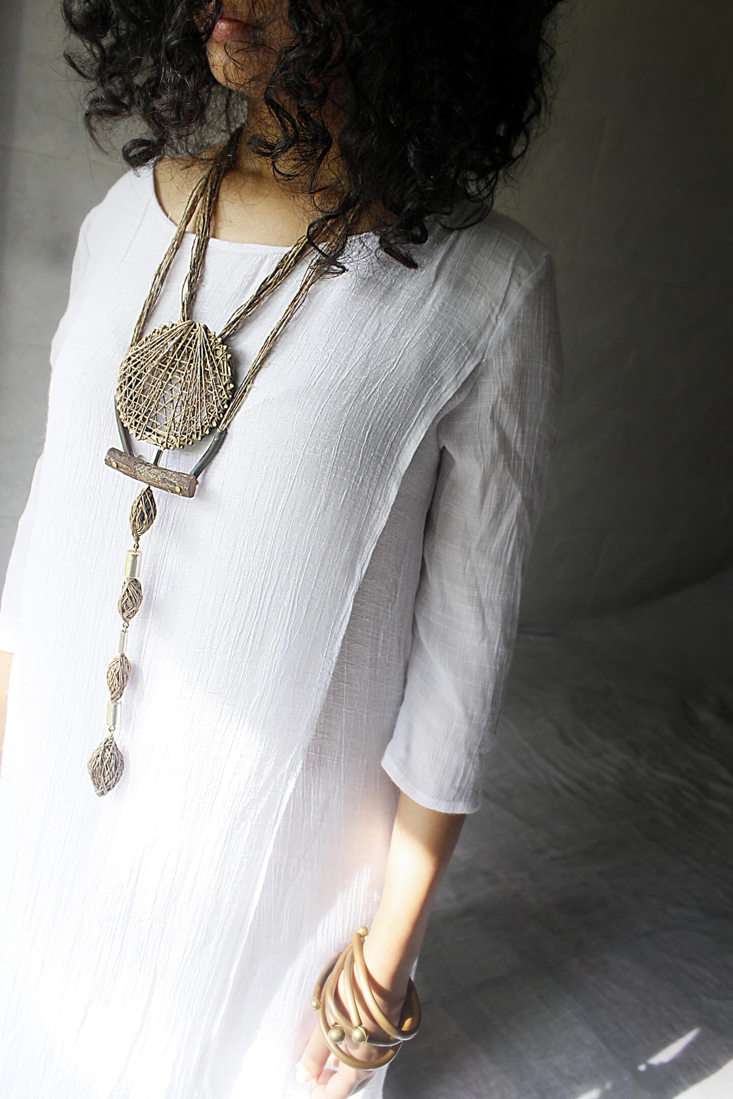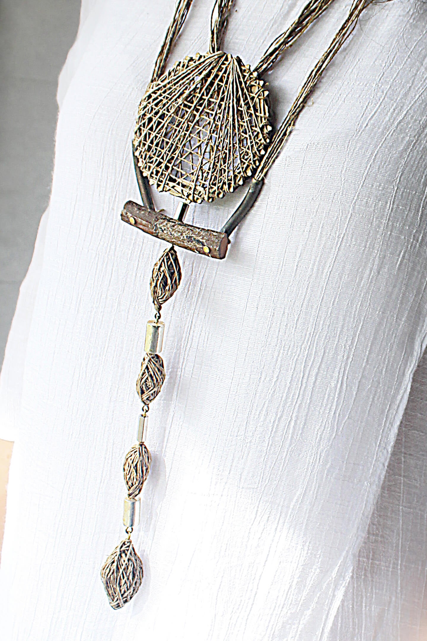 This neckpiece is crafted from sustainable materials, including hemp fibre, up-cycled industrial metal pieces, and natural stones sourced from rivers across India.